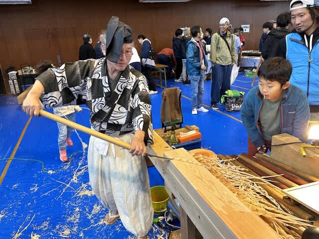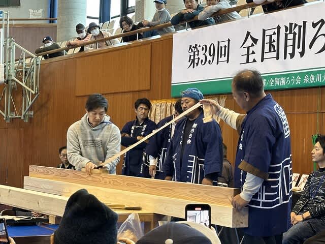 カンナの薄削りに挑む「全国削ろう会」が糸魚川で開催されたので見学にいったら、宮大工が槍ガンナの体験会をしていた。