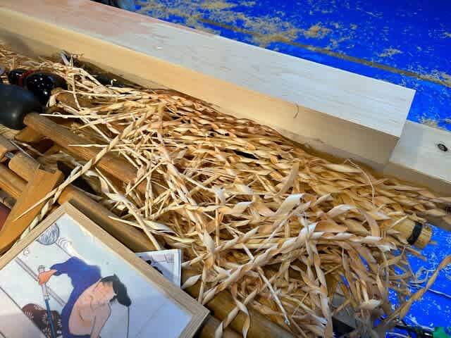 上の直径20㎜くらいのロールになるのが宮大工さんのカンナ屑で、下の半分くらいの太さがわたしのカンナ屑。この理由は材木に対して45度の角度が正しく、わたしは30度くらいの角度であるからだそう。初めての素人にしては上手だよね?w