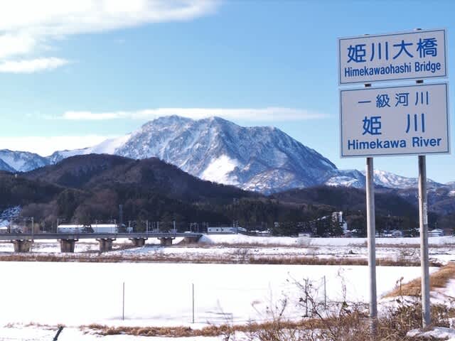 姫川を西に渡った左岸から黒姫山を望む。現在は山頂に多賀明神が祀られているが、口碑には奴奈川姫命・奴奈川彦命・黒姫命の三柱を祀るとあり、黒姫は奴奈川姫の母神とも、黒姫は奴奈川姫ともあるので、奴奈川姫は皇后で黒姫は上皇后のような世襲制の女系家族であったことを伺わせる・・・かなぁ。
