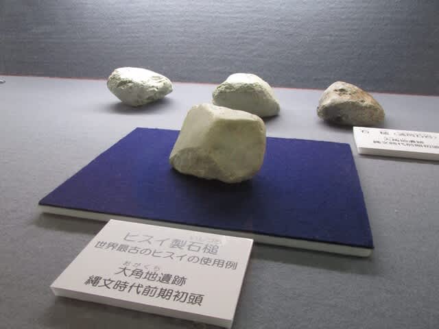 糸魚川市長者ヶ原遺跡考古館の展示品。友人のオランダ人考古学者のイローナ博士は、アルプス山麓に硬玉ヒスイ製の長大な磨製石器を威信材にした文化が7,000年前にあったとレポートしている。老婆心ながら威信材や装身具ではなく未加工の道具としての前期初頭の使用例だから「国内最古級のヒスイの使用例」と表記した方が無難かなぁ・・・これも何度も書くけどw
