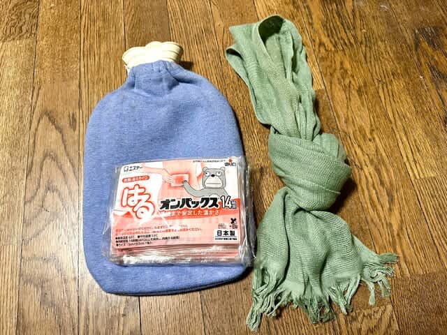 湯たんぽとマフラーは普段つかいできるサバイバル用品。