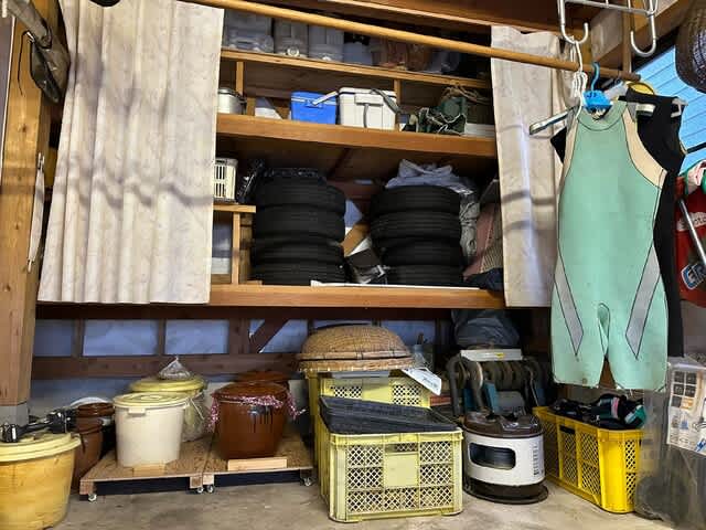 ガレージ奥の造り付棚の不用品を整理して、中段をタイヤ置き場にしたので、少なくとも凶器になることはないだろう。味噌樽や漬物樽は、お袋が動かしやすいようにキャスターを付けた台に乗せ、最下段の奥へ収納。