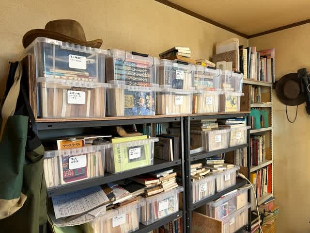 熟考の結果、本棚は自作フレームを間柱とスチールにビス止めして、重い画集や資料は下段、文庫本サイズは分類ごとに半透明のプラケースに入れて収納してみた。