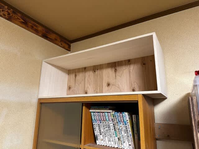 こちらの棚は倒れなかったが、上部にDIYした木の箱を載せて間柱に固定しておいた。本棚の右に飛び出ているのは間柱にビス止めするため。