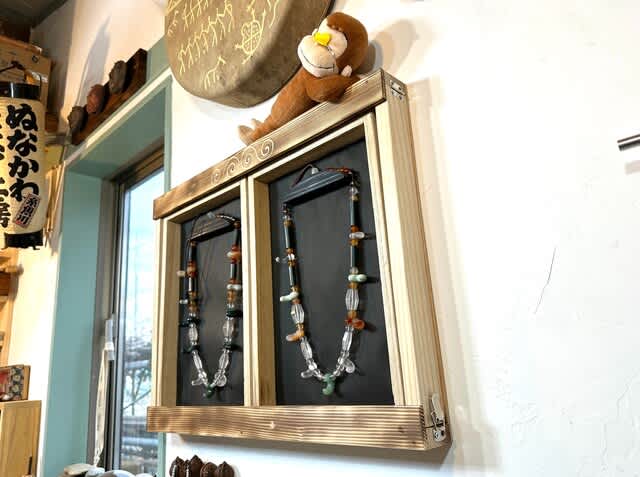 桐箱に入れて立てかけてあった「古代風首飾りヌナカワ姫・ヌナカワ彦」は地震で落ちたので、紙芝居の箱式の収納箱の横から出し入れできるように壁固定。こんな時のために塗り壁下地は、石膏ボードの下にベニア板を捨て貼りしてあるのでどこでもビスが効く。面倒だけど大事なこと。
