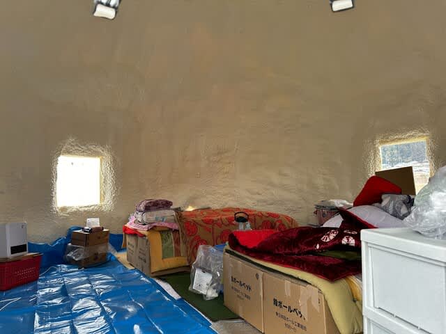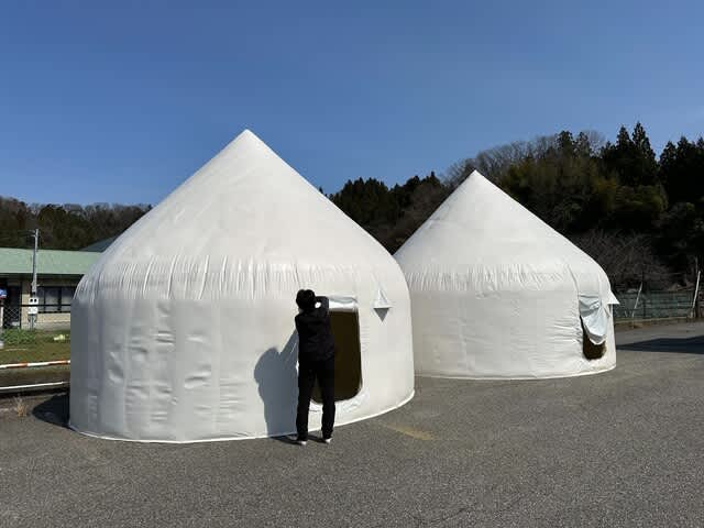 空気をいれて膨らませたターポリン製外皮の内側に発砲ウレタンを吹き付けて自立させる簡易性はよいにしても、被災地で聞いた情報では5年、ネットでは未知数と出ている耐用年数と、不要になった場合は埋立ゴミに分別する素材という点が気になる。