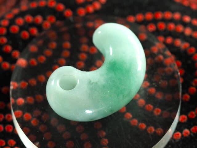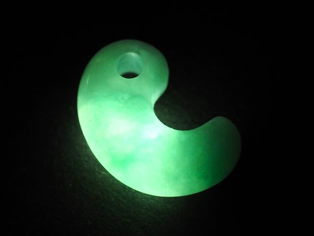 光をヒスイに透過させて浮かび色にもいろいろあるが、緑一色だとおお!と唸る。ヒミコやヌナカワ姫も太陽に透かしてみたに違いない。
