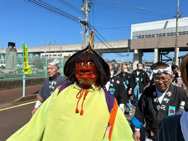 祭りで一番の名誉が鶏爺の大役で、押上区は赤い色で口をひらいて舌をだした面、寺町区は赤茶色で口を引き締めた歯嚙(シガミ)の面をしているので、阿吽を意味しているのかも知れない。