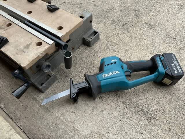 イレクターパイプは鉄製で専門工具でカットするが、今回は被災地支援用に購入したレシプロソーを初使用。高速回転するグラインダーだと火花や騒音が酷く、工作精度もひくくなり勝ちだけどレシプロソーは日曜日の住宅街でつかっても近所迷惑にならない。
