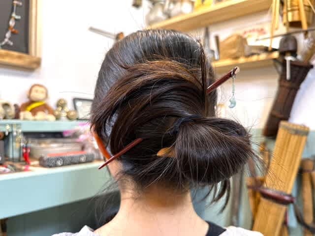 しかしこれではカンザシとしては長すぎるので、カンザシ愛用者から聞き取った「長くても18~20㎝が適切」との意見をとりいれて長さ6寸(18㎝強)を常寸にすることにした。モデルは工房に遊びにきた女友達の理恵嬢。