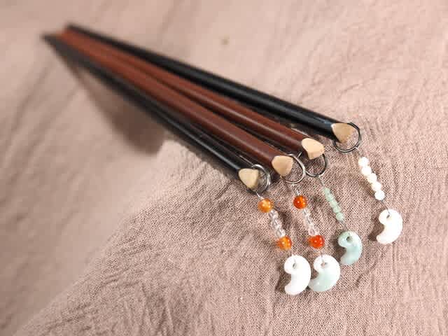 左が加工前の塗り箸で右が「ぷるぷるゆれる勾玉カンザシ」の加工品。