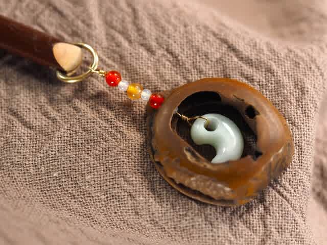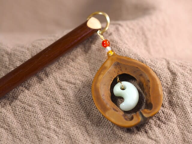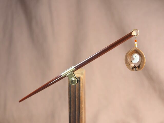 「ぷるぷるゆれる勾玉カンザシ」の5本目は、本物のクルミの殻と勾玉を母胎に浮かぶ胎児のイメージにしてみた。