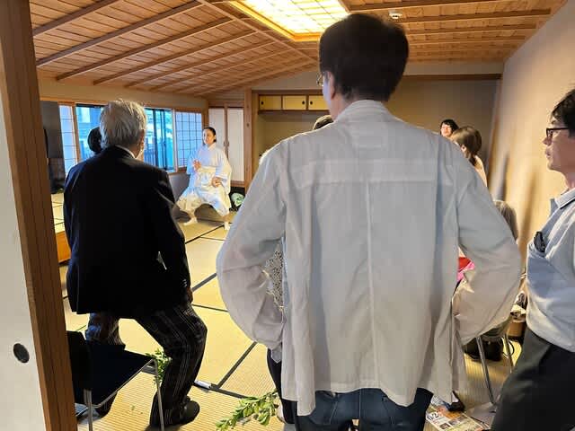最初は春日神社の大島宮司による舞いのワークショップ。座敷に入りきれない参加者もいた。