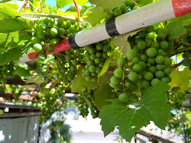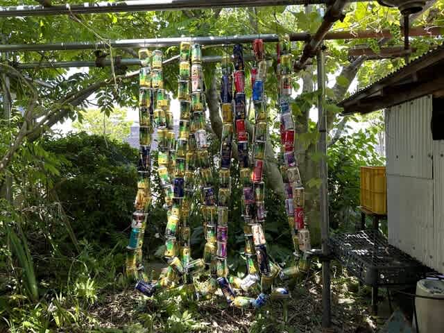つなげた空き缶クーラーの置場に困り、ブドウ棚にぶら下げたら七夕飾りのようw