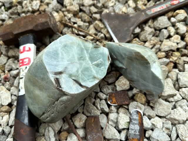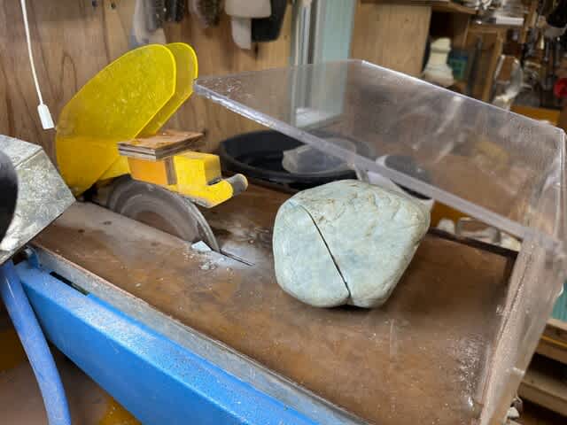 ヒスイ原石は小割機でカットするが、カット能力は厚み4㎝くらいまでだから、厚み10㎝もある原石は手に持って回転させながらカットして、最後はクサビをいれて割る。