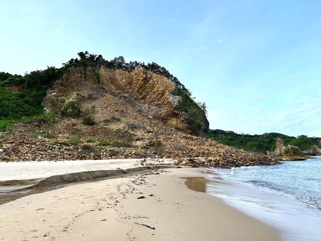 椰子の実の欠片もおちていて、地形好き・考古学好き・民俗学好きには興味がつきない浜。複雑に入り組んだ沿岸には海浸洞もあるから、シーカヤックで岬めぐりをしても面白そうだ。