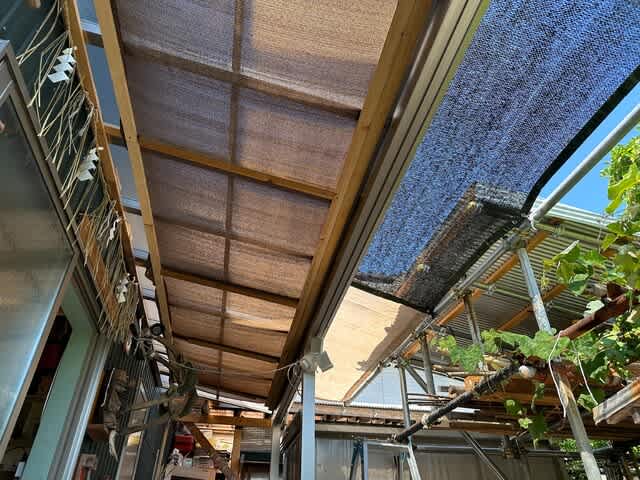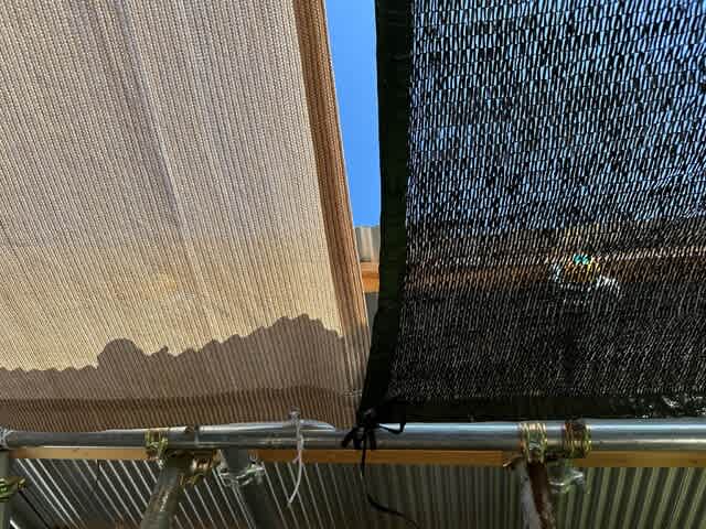ぬなかわヒスイ工房の玄関テラスの上に遮光ネットをかけて、手前の遮光率65%の黒と、奥に明るいベージュの遮光率80%を比較してみた。
