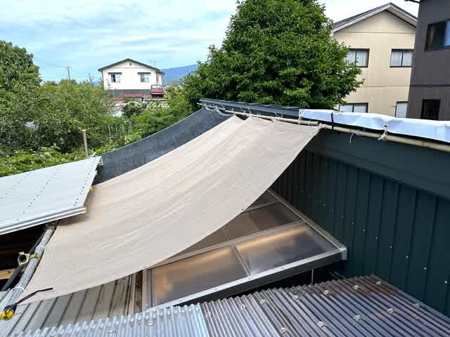 今回は工房の屋根下の外壁から張って、西日の直射を建物から遮ってみた。