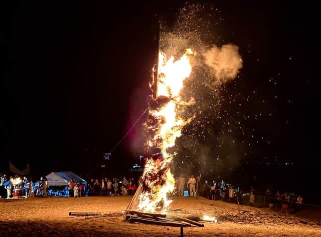 かっては巨大松明の燃え尽きから提灯の灯りをとり、自宅に持ち帰ってお盆の迎え火としていたそうだが、現在は大音量のアナウンスと煌々と照らしたライトもつかった今どきの夏のイベントとして命脈を保っている。