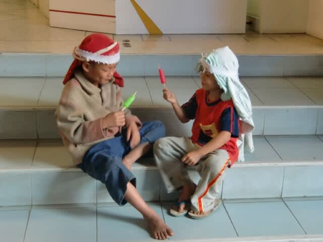 この子供の巻き方は特殊で、ふつうは額をおおって後頭部で縛り、あまった部分を首筋に垂らす方式。