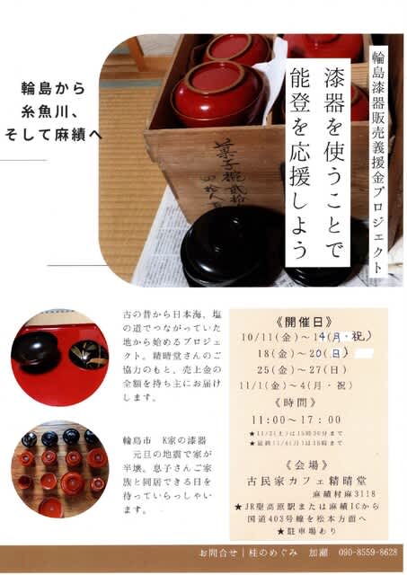 信州の麻績にある「古民家カフェ精晴堂」さんの玄関を間借りして、都内在住の加瀬桂子さんが、長野県初の輪島漆器義援金プロジェクトの展示販売会をスタート。