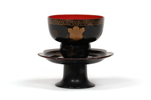 こちらの黒い漆器が「国立アイヌ民族博物館」のサイトからお借りした収蔵品の写真。椀の下の脚つきの台が天目台で、本来は茶道の天目茶碗の台だった。輪島漆器の呼び名は高茶台。