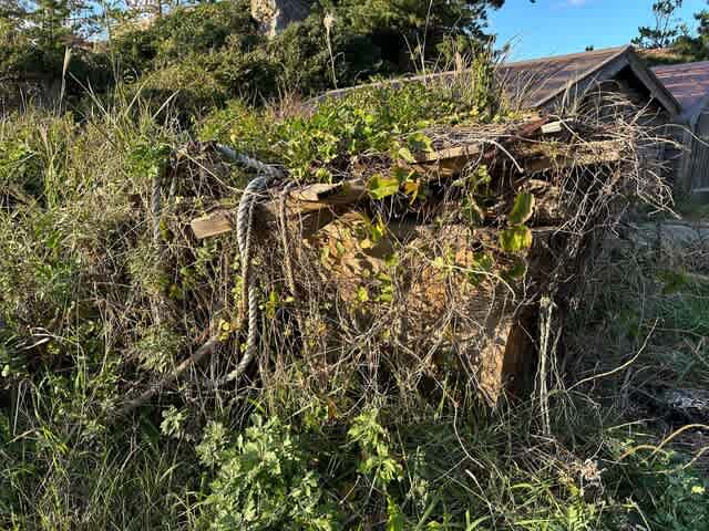 崩落した「窓岩」のすぐ横に、雑草に覆われて雨ざらしになった木造漁船をみつけた。