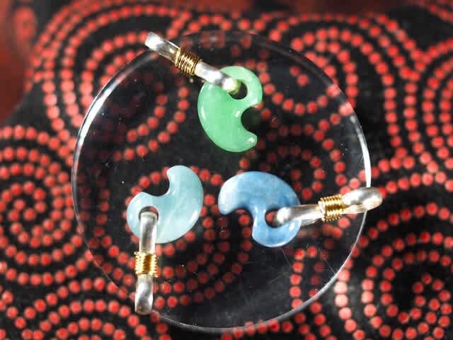 黄緑色の勾玉はロウカン(琅玕)と尊称される最上級品。淡い蒼の勾玉はイリコンヒスイの不純物のない大トロ部分。濃い蒼の勾玉はコバルトヒスイ。