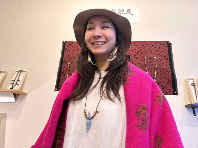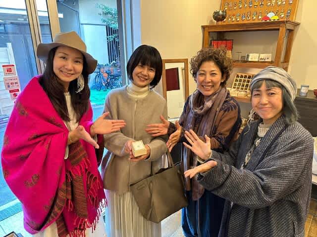 目玉商品の「neo縄文大珠」を試着してもらい、「女優になれ!」「魔女になるのだ!」と笑わせてにぎやかに記念撮影。