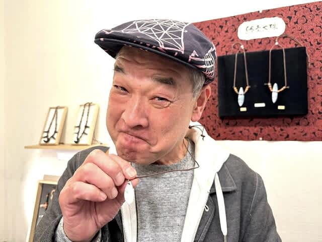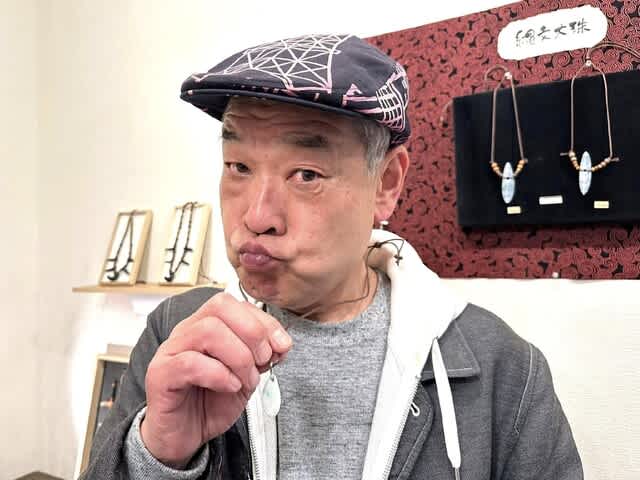 「糸魚川翡翠展2024」初日に、「ワハハ本舗」創始者のひとり、俳優の佐藤正宏さんがお守りにして舞台にあがりたいと、木の葉形のペンダントをお求め。