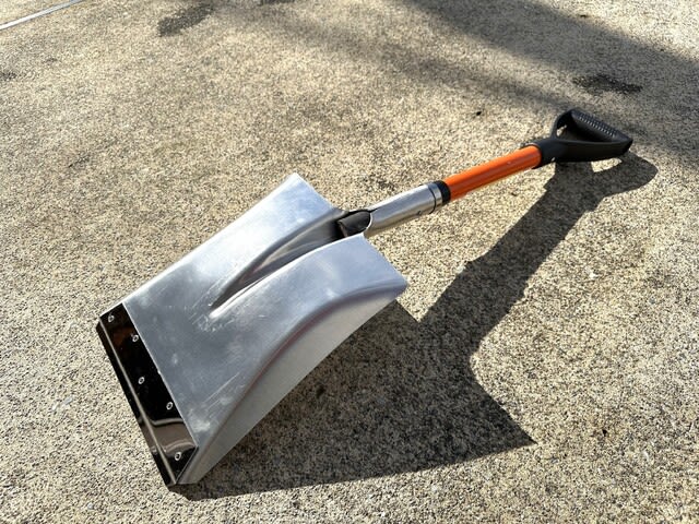 同じアイデアのスコップがコメリで半額で売られているが、こちらはステンレス板の固定ボルトが裏表ともに出っ張っていて、着氷やアスファルトに引っかかってもどかしいと思う。