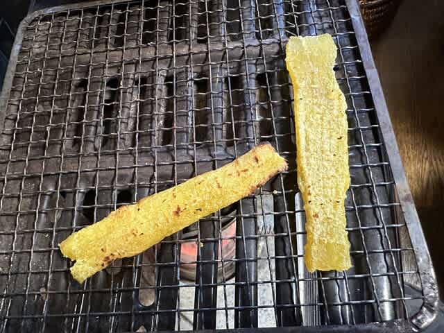 ストーブで軽く炙って食うとトロトロに柔らかくなる。農業セーネンのおふくろの味を堪能。
