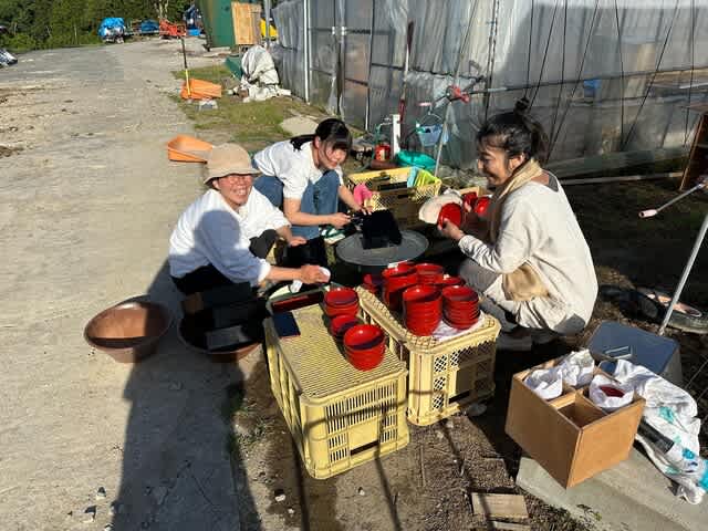 漆器を一緒に洗うのは長崎県から来た漆器展示販売ボランティアの早崎さん(右端)