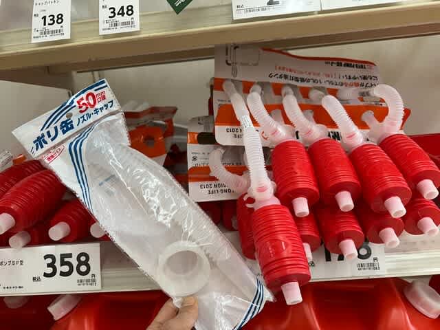 ポリタンクにつける「ポリ缶ノズルキャップ」なる蛇腹ホースかあれば水はこぼれないが、20キロちかいポリタンが重いことに変わりないので、水専用に灯油用のポンプを買い足した。