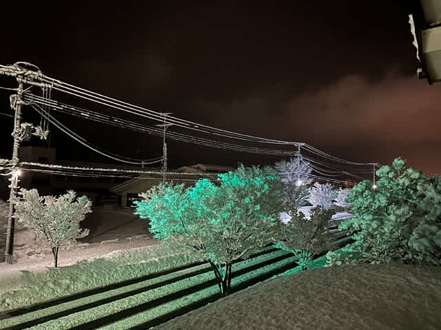 寝る前に外を見たら、氷結した街路樹に信号の緑が映り、はじめて見る幻想的な風景に見惚れた。