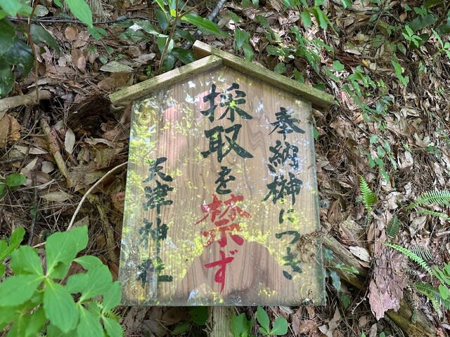 倒れた看板の左の奥に平坦地があり、旗竿と奉納されて植樹したらしい榊があったので、江戸期は天津神社の神領であったのではなかろうか?