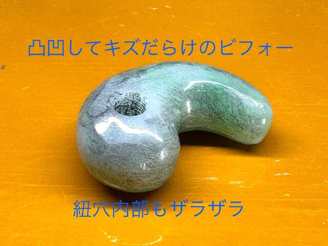 一体どういう料簡の人がつくったのか、仕事を舐めているとしか思えないつくりに、呆れを通りこして怒りすら覚え、哀れな「勾玉のカタチをしたヒスイの塊り」から、「ヒスイでつくった勾玉」として再生させる作業だ。