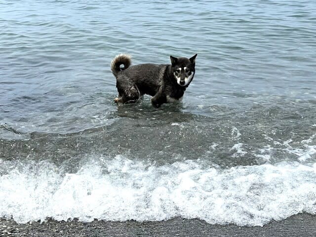 宮崎さん一行のツアーの最後にヒスイ拾いに行ったら、帰るころになって縄文犬ゲンが海に飛び込んだ。砂だらけのゲンに宮崎さんは渋い顔で、申し訳ないが笑ってしまった。