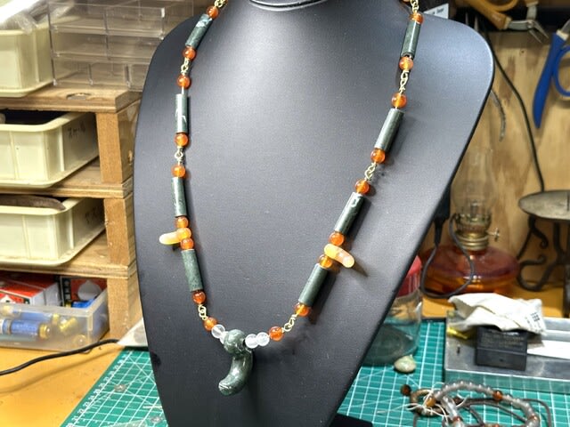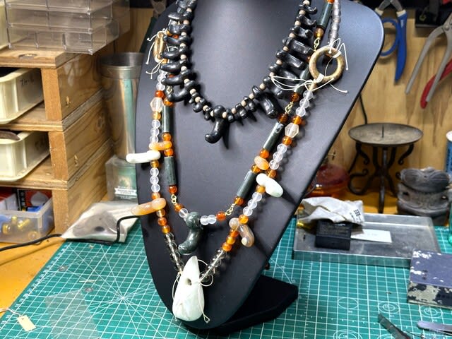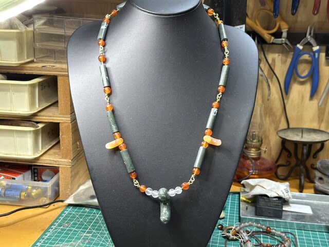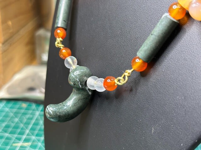 そこで重要文化財の「硬玉翡翠金鎖付首飾」を参考にして、来客に勾玉の解説と記念撮影用につくった首飾りがいくつかあるので、緑色岩の連珠に試みた。
