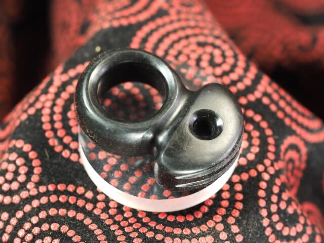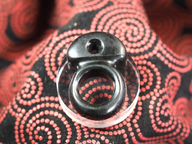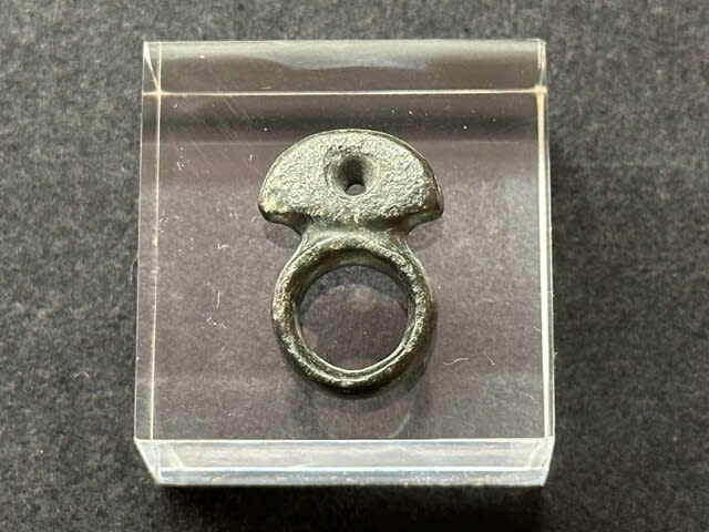 指輪だとすると子供しか無理のようだが、小穴があるのでペンダントかも。ちなみに似たような遺物は金沢市の北塚遺跡など北陸地方にいくつかあるようだ。