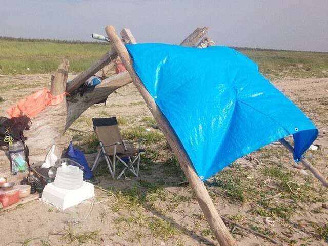 そこで漂流物から支柱をみつけ、ブルーシートを張って日除けシェルターをつくり、日中をすごしていた初期型