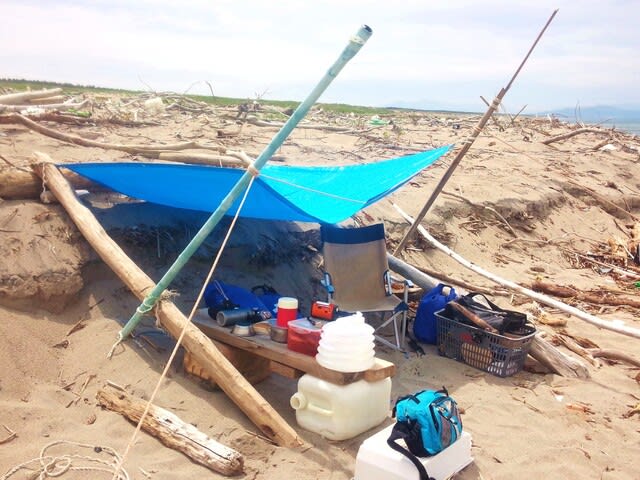 海のヒスイロード検証実験航海の時は海岸でのテント泊が基本だったが、サバイバル用にシーカヤックに1.8m角のブルーシートと6㎜の細引きを積んでいた。