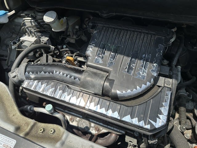 車の吸気系の樹脂カバーにアルミテープを張ると燃費が向上するというトンデモ説(笑)の検証実験中。