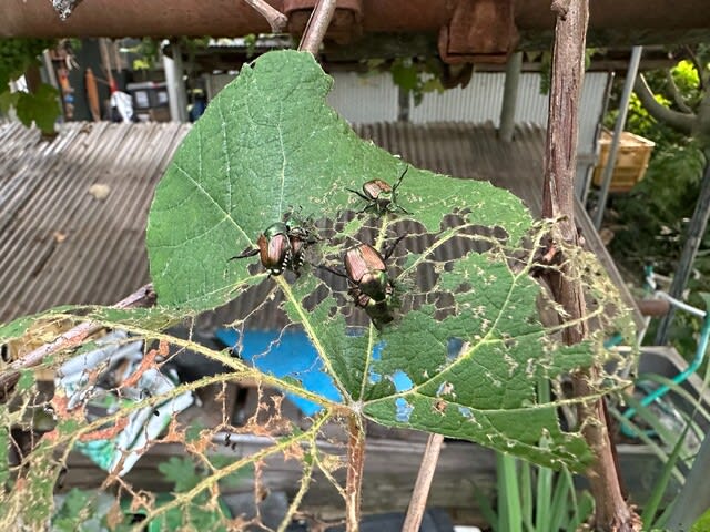 ブドウの葉っぱはアメリカシロヒトリに入れ替わり、小さな甲虫の新婚生活の場になっているが、アメリカシロヒトリのようなパンデミックでもないし、いつか飛んでいくだろうからと様子見だ。