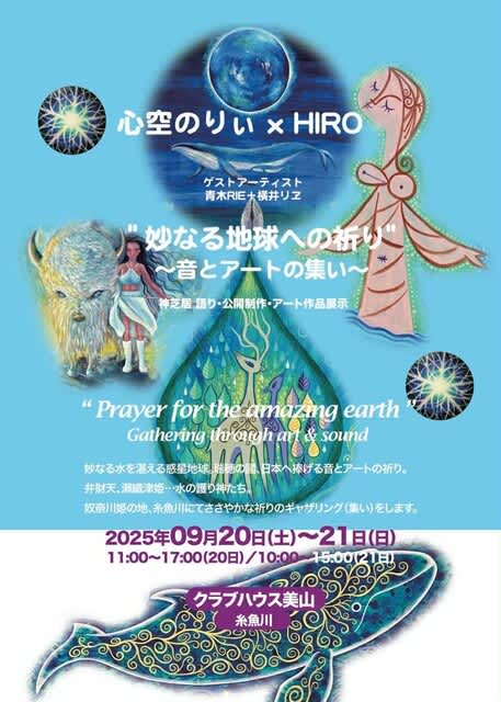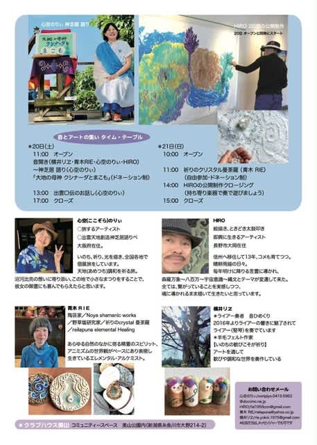 「出雲口伝」に記述されたヌナカワ姫伝説の語り部をしている、のりぃさんのお話し会と、地元のリエちゃんの音楽、信州の青木夫妻のアートの集い。