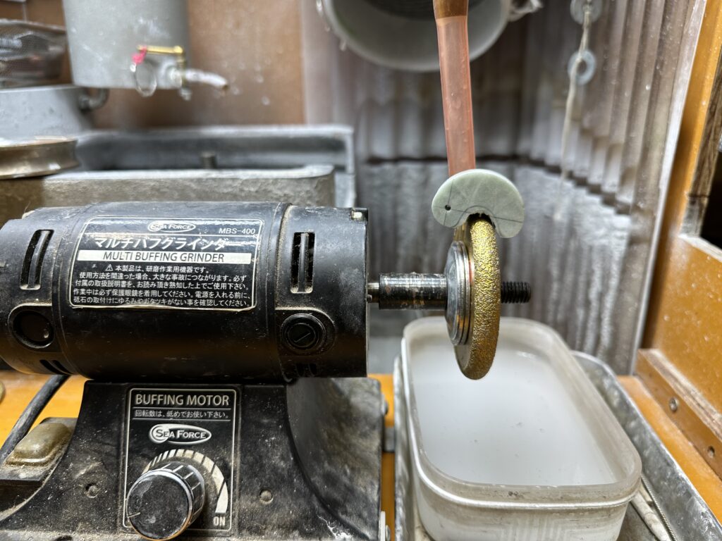 両頭グラインダーに取り付けて加工してみたが、いかにも「勾玉のカタチになってりゃいいんでしょ!」といった感じの、側面が扁平な勾玉になってしまうのが、面白くない。