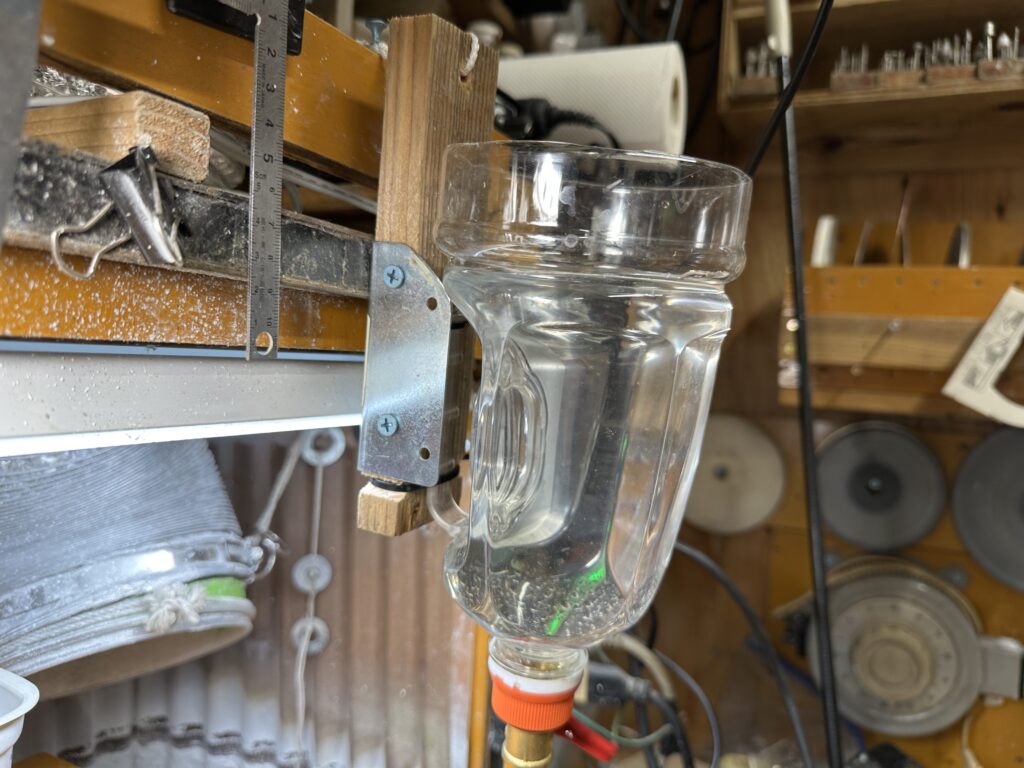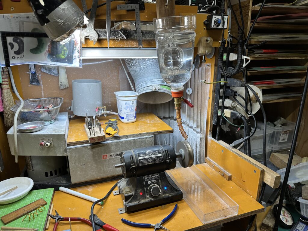 こちらは背部の丸みを削り出す特殊工具で、水を点滴しながらつかうので、ペットボトルで自作。