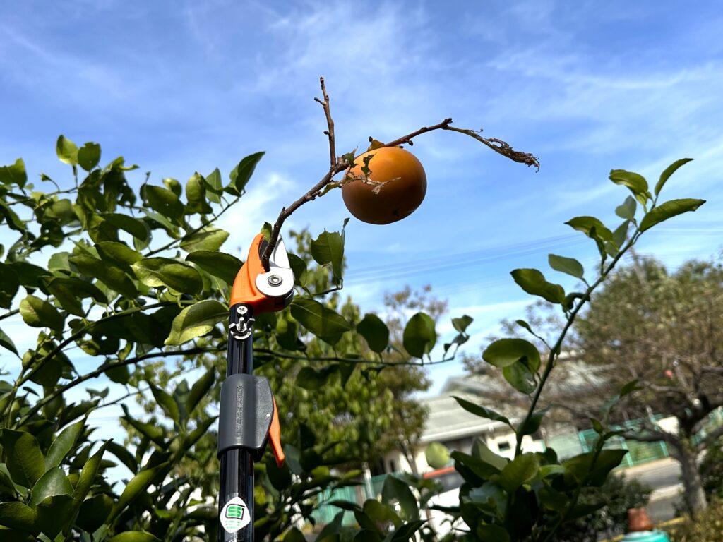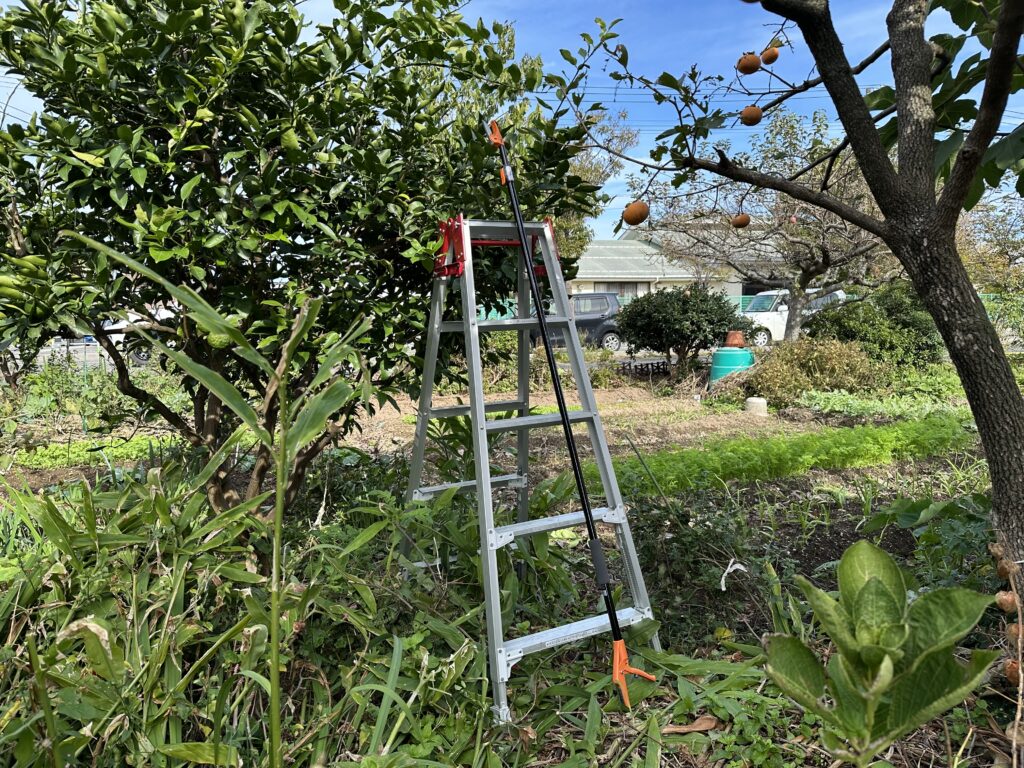 田舎暮らし2025年10月27日高枝伐りバサミとスッピン・・・果樹収穫の味方