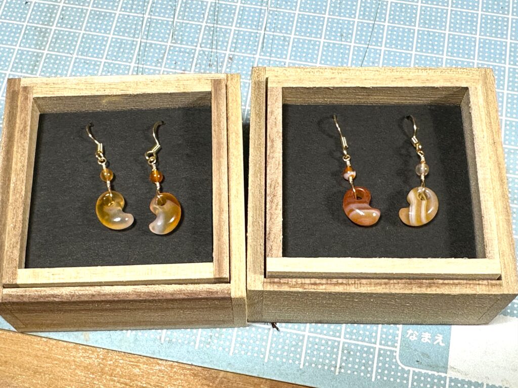ピアスのパッケージは見えること、手にとりやすいことを念頭に、これまでは台紙をいれたビニール袋にしていたが、外国人が勾玉ピアスを買ってくれたので工夫次第でもっと売れると睨み、勾玉と同じく桐箱に収めることにした。