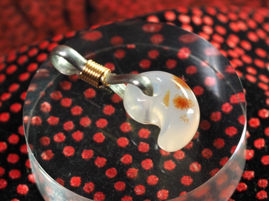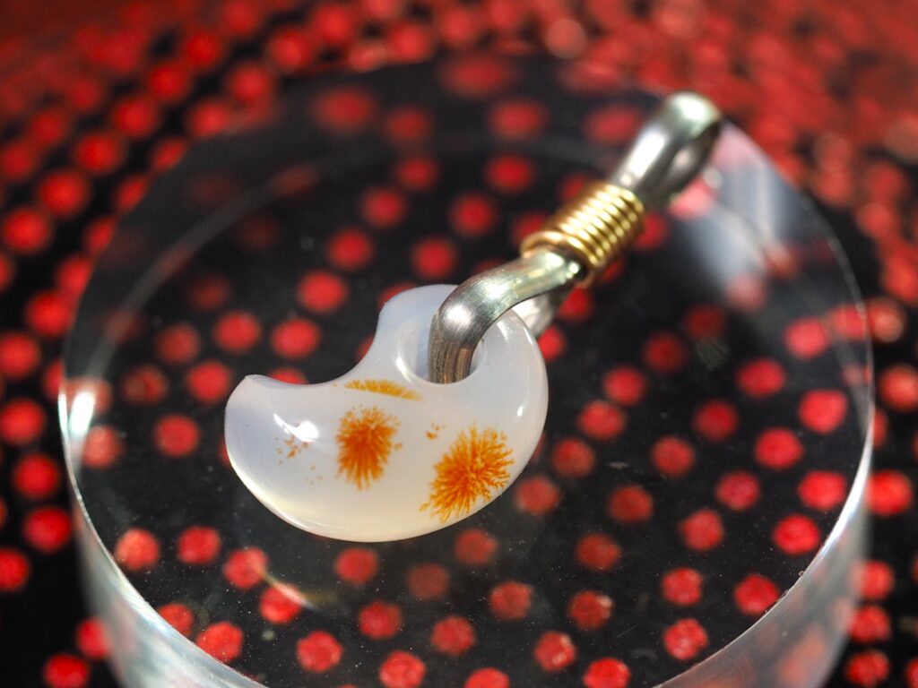 乳白色ベースにちいさな赤い差し色の赤メノウは、普通なら商品価値はないと捨てられるだろうが、個性を引き出すのがプロというもので、差し色を主役にした超小型勾玉をつくり、花火が咲いて明るくなった夜空の風景として「花火」と名付けた。